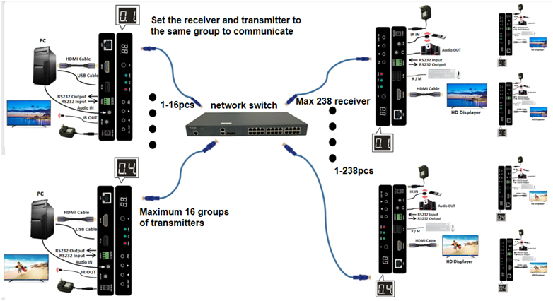 可通过Cat5e及以上规格的单根网线将HDMI音视频信号高清传输至150米,支持TCP/IP网络协议,可通过交换机实现多个发射机对多个接收机传输,远距离传输的同时支持独立音频传输,支持红外、键盘鼠标信号回传,RS232串口双向传输,可在显示器端远程控制播放器,在为用户降低成本的同时保证信号的稳定。