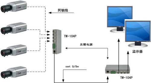 在实际工程中,TW-104P既可以当发射器,也可以当接收器使用,可传输4路视频、音频或控制信号,传输距离为0-300米,双绞线质量好时可达600米以上。TW-104P也可以与TW-101AR、TW-104AR、TW-108AR配对使用,传输距离在600-900米。TW-104P干扰抑制及抗电磁辐射能力较强,可以在各种干扰情况较复杂的环境里使用,并且也不对外界产生电磁干扰,是相当环保和经济的。同时,五类或五类以上非屏蔽双绞线中共有的4对线,每一对线都可以传输一路信号,可以使电话、RS485控制数据、音频、多路视频甚至低压电源共缆传输。